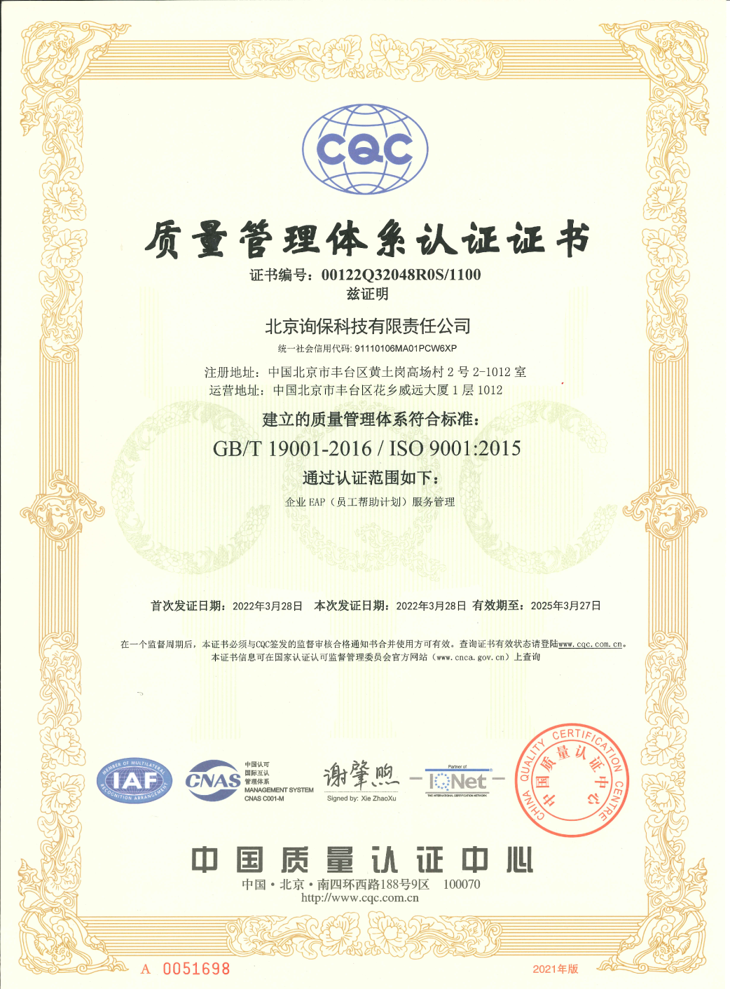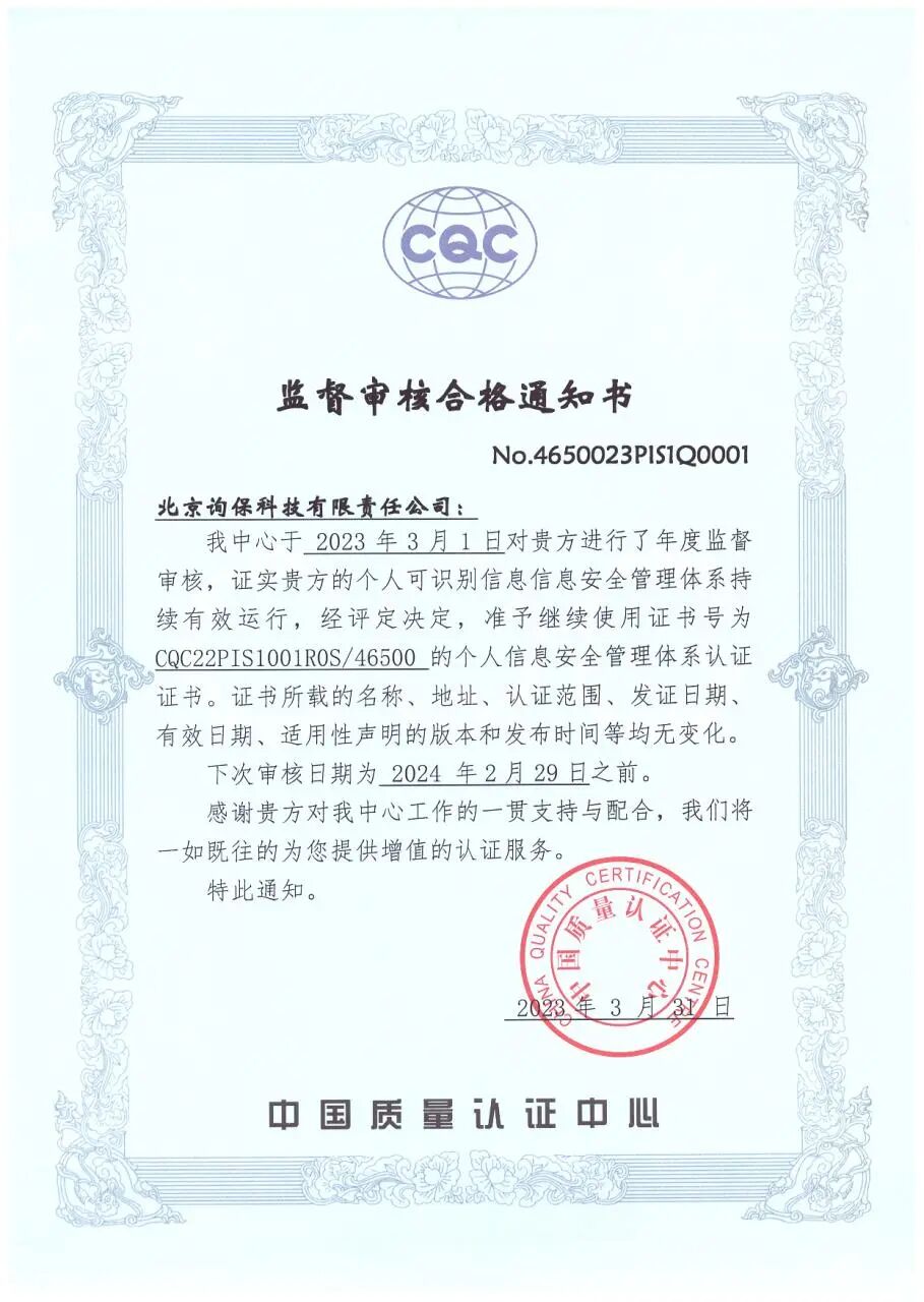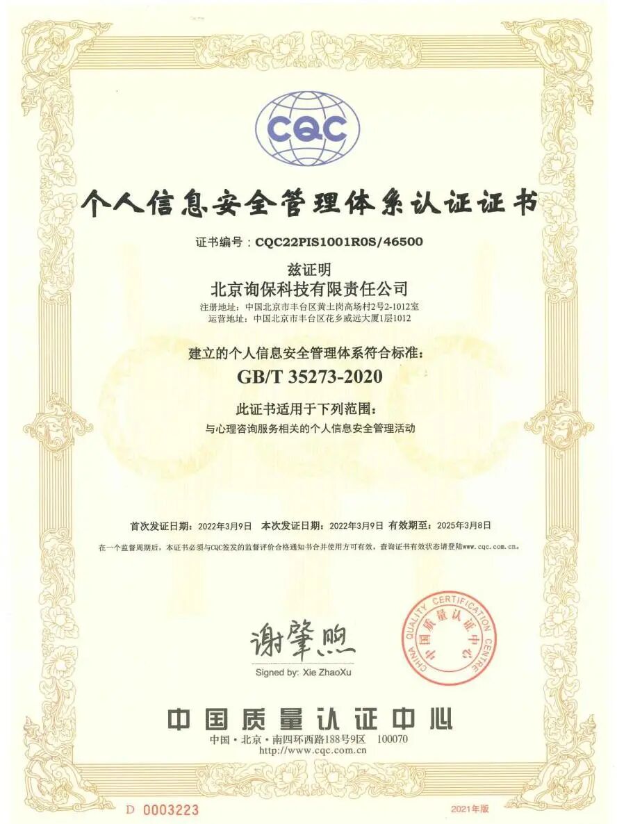 新闻丨唯询心理个人信息安全和EAP服务体系认证通过发表时间:2023-04-09 12:17 点击蓝字·关注我们 近日,质量管理体系认证及个人信息安全管理体系认证审核小组进驻唯询心理,开展对唯询心理以上两个认证的年度审核工作。凭借更加优质的服务体系,我司顺利完成中国质量认证中心的年度审核。 对于心理行业从业者而言,这两项认证是对我们服务的充分认可,也是合作伙伴的信心加强剂。 个人信息安全管理体系认证,认证的具体范围为:与心理咨询服务相关的个人信息安全管理活动。 众所周知,在心理咨询服务中,最重要的便是用户隐私保密。如何保护来访者的个人信息安全,如何安全的管理来访的个人信息,是从事心理服务行业首要面对的问题。 此项认证标志着,唯询心理针对心理咨询服务,已构建起完善的安全管理体系,可有效确保服务过程中个人信息的安全。 质量管理体系认证,认证的具体范围为:企业EAP(员工帮助计划)服务管理。据悉,关于此项认证,唯询心理是行业首家。 唯询心理主要的一部分业务,就是向企业提供优质的EAP服务,此项认证标志着,唯询心理针对企业EAP(员工帮助计划)服务管理搭建起了完善的运营体系,能切实帮助企业及其员工高效且有价值的使用心理服务。 在之后的工作,我们会不断地完善,把最好的服务呈现出来。 △ END △ 合作请联系我们 北京询保科技有限责任公司丨唯询心理 400-800-9087 ![]() |