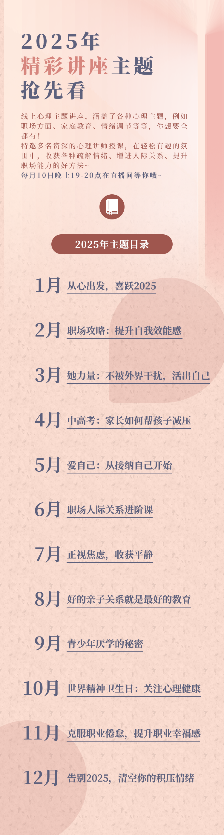 资讯 | 家庭这本经,怎么念才能摆脱一地鸡毛?发表时间:2025-01-19 00:24 点击蓝字·关注我们 生活在现代社会的我们,时常面临着各种各样的挑战。 我们或许都有过这样的时刻: 面对堆积如山的工作,感到力不从心;看着同事晋升加薪,而自己却原地踏步,心中五味杂陈;甚至有时候,领导的一句批评或同事的一个眼神,都能让我们陷入深深的自我怀疑。 家庭,这个本应是我们最坚实的后盾,是我们放松充电的地方,却时常让我们感到无力和纠结。 在家庭教育的过程中,我们不仅要面对孩子的成长问题,还要处理夫妻之间的关系,以及如何与长辈沟通等问题。这些问题让我们时常陷入两难的境地,不知道该如何抉择。 快节奏的生活更是让我们喘不过气来。工作、生活、社交……各种琐事和压力像潮水一样涌来,让我们的情绪像过山车一样起伏不定。 焦虑、烦躁、抑郁……这些负面情绪像阴影一样笼罩着我们,让我们感到身心俱疲,甚至有时会对生活失去信心和热情。 ![]() 幸运的是,此次系列心理讲座正是为了解决这些难题而来。它涵盖了职场心理、家庭教育、情绪调节等多个与我们生活息息相关的维度。 无论你是为工作中的人际关系焦头烂额,还是为孩子的教育问题辗转反侧,亦或是为自身情绪的不稳定而苦恼不堪,在这里,都能找到相应的答案。 我们特邀了多名资深的心理讲师来授课。他们拥有丰富的专业知识和实践经验,能够从专业的角度深入剖析各种心理现象,为大家提供科学、实用的指导和建议。 在轻松有趣的氛围中,你将收获各种疏解情绪、增进人际关系、提升职场能力的好方法。 预约直播 ⭐️关注唯询心理视频号,点击直播预约,即可预约下月的直播哦! ⭐️或每月10日晚19点-20点,准时进入唯询心理视频号,与我们一起探索心理的奥秘吧! △ END △ 业务垂询 北京询保科技有限责任公司丨唯询心理 400-6080-650转0 ![]() |